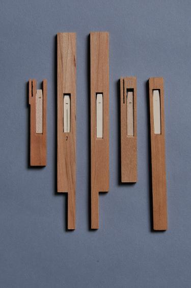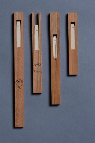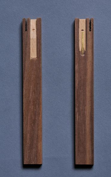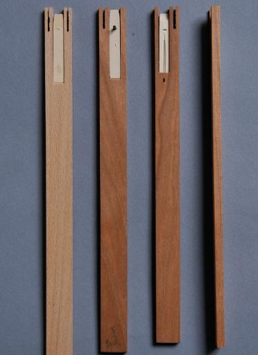 The jack bodies are of fruitwood, cherry, pear, or apple, depending on availability. The tongue is of holly and can be punched for either crow quill or the more common delrin and celcon.